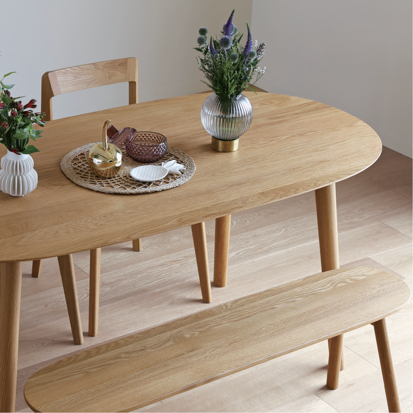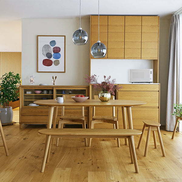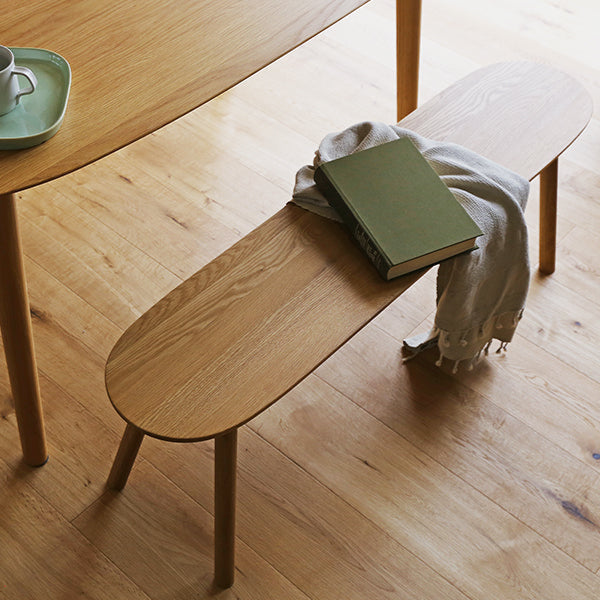 座面邊緣以圓滑工法細緻打磨,突顯輕盈與柔和的設計感,有兒童的家庭也能安心使用。與餐桌曲線呼應的椅凳與長凳,體積精巧、可完全收納至桌下,使餐廳空間更開闊寬敞。