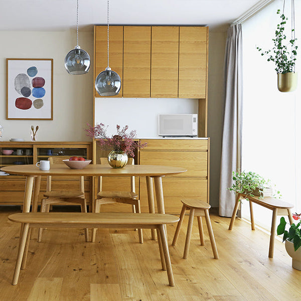 座面邊緣以圓滑工法細緻打磨,突顯輕盈與柔和的設計感,有兒童的家庭也能安心使用。與餐桌曲線呼應的椅凳與長凳,體積精巧、可完全收納至桌下,使餐廳空間更開闊寬敞。