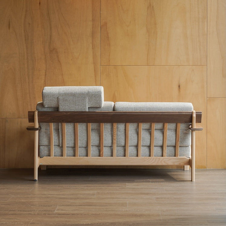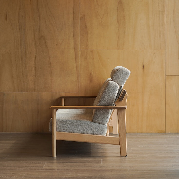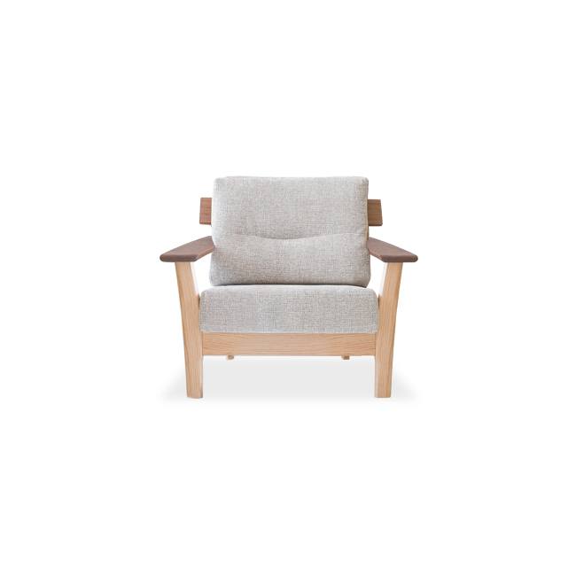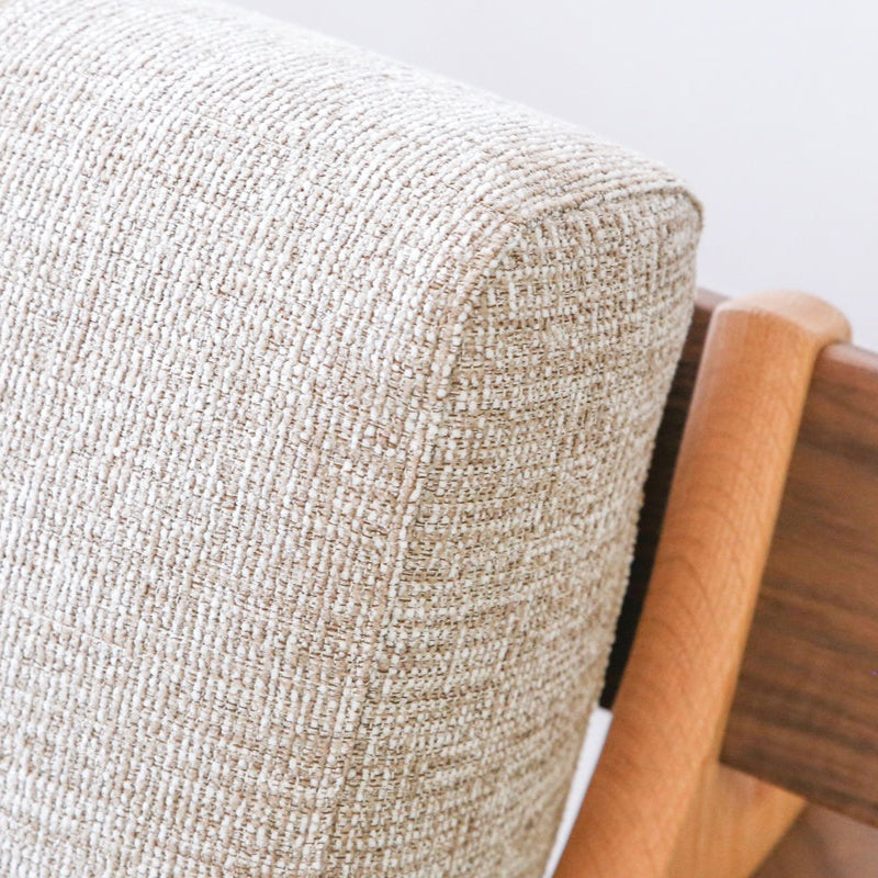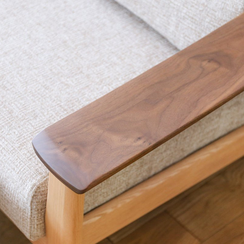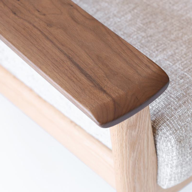 扶手處經過職人手工細膩打磨,木質紋理清晰可見,觸感溫潤滑順。沙發椅背以流暢的曲線勾勒視覺焦點,即便擺放於空間中央也不尷尬,散發自然原木氣息與優雅質感。