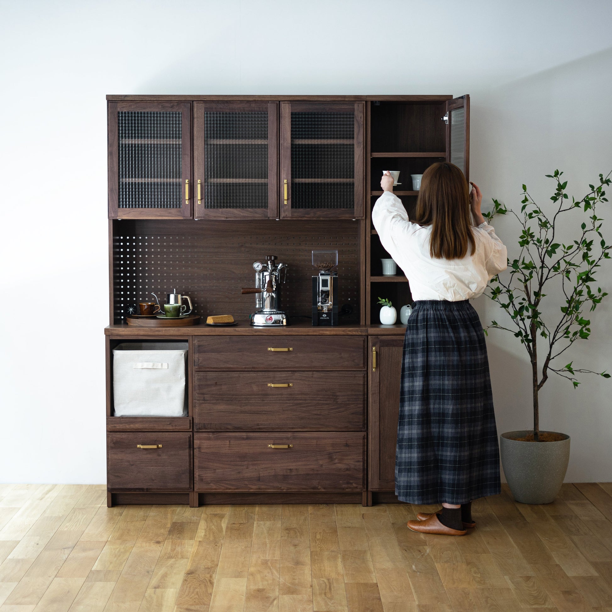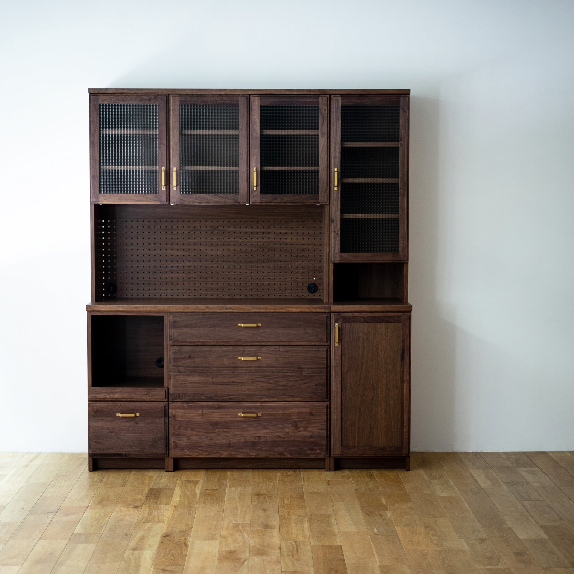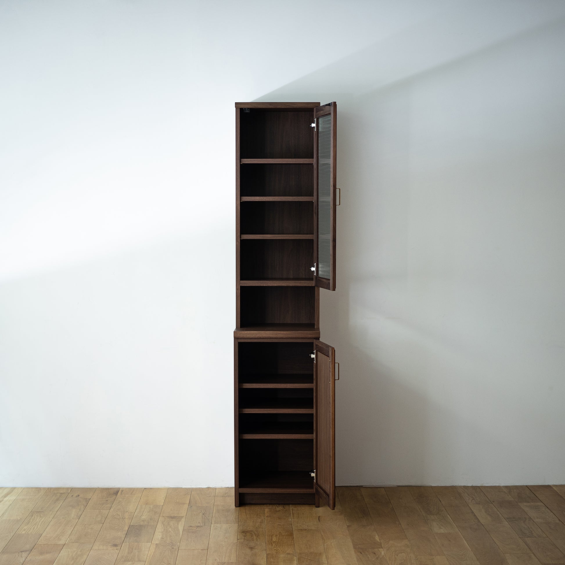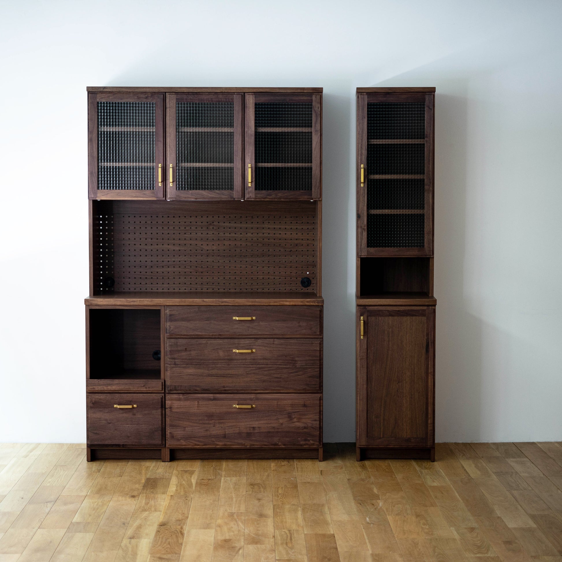 整體高度達 190 公分,亦可左右組合 83 公分半腰款式,可作廚房收納櫃、咖啡櫃、收藏展示櫃或書櫃⋯⋯等,是一款多用途收納櫃。依據喜歡的風格,搭配精緻的銀色或黃銅把手,挑選透明、霧面或復古格紋玻璃,打造獨特的日本木製收納櫃。
