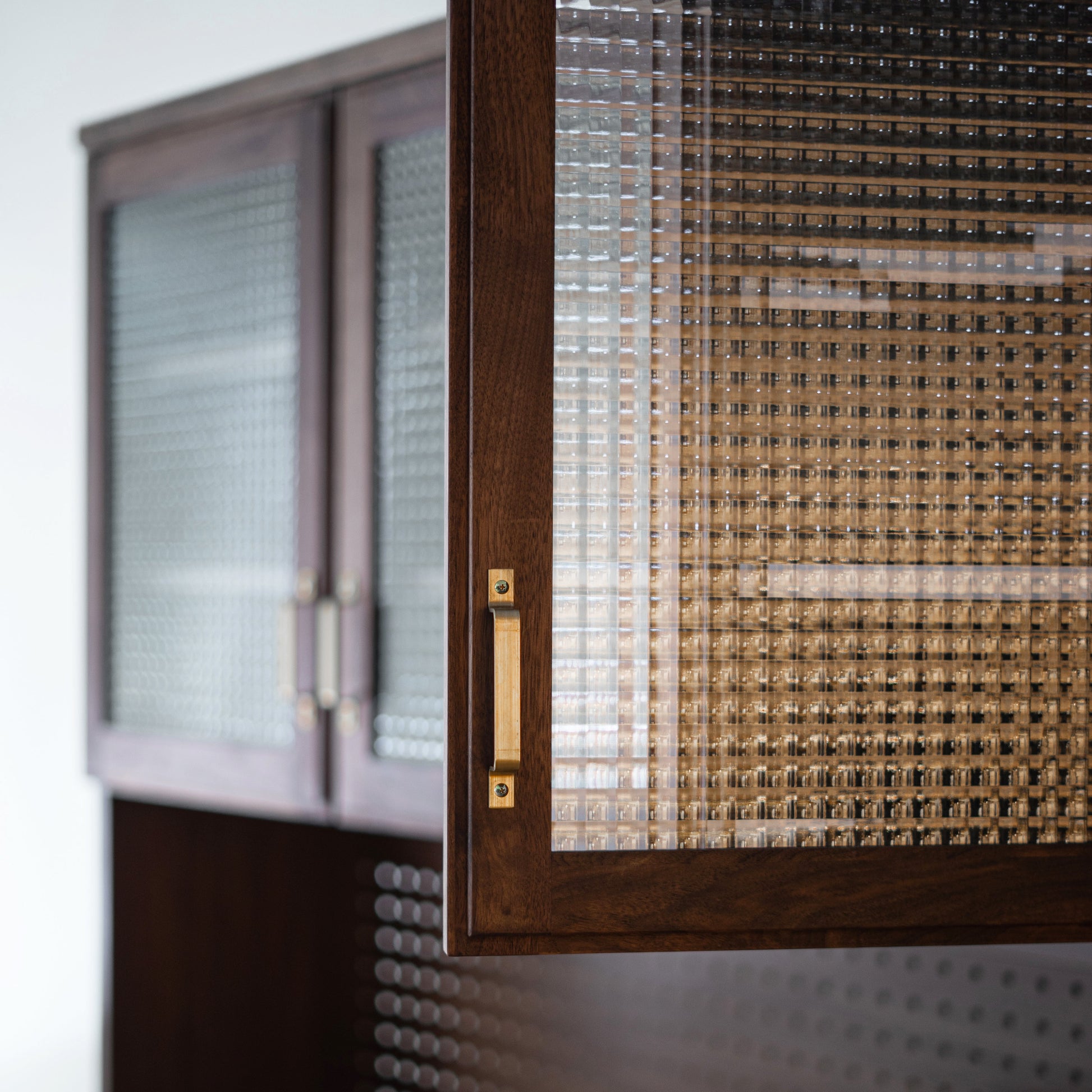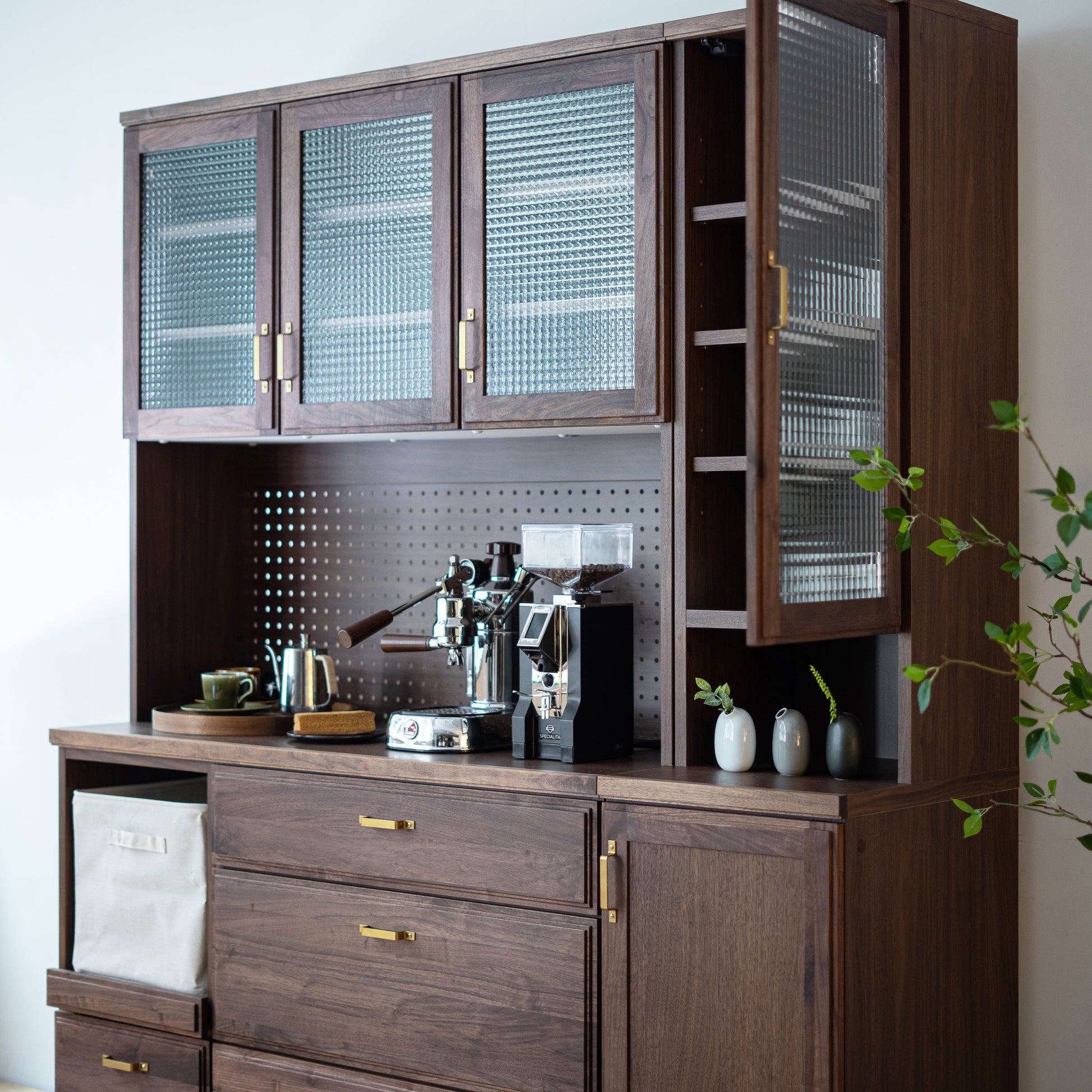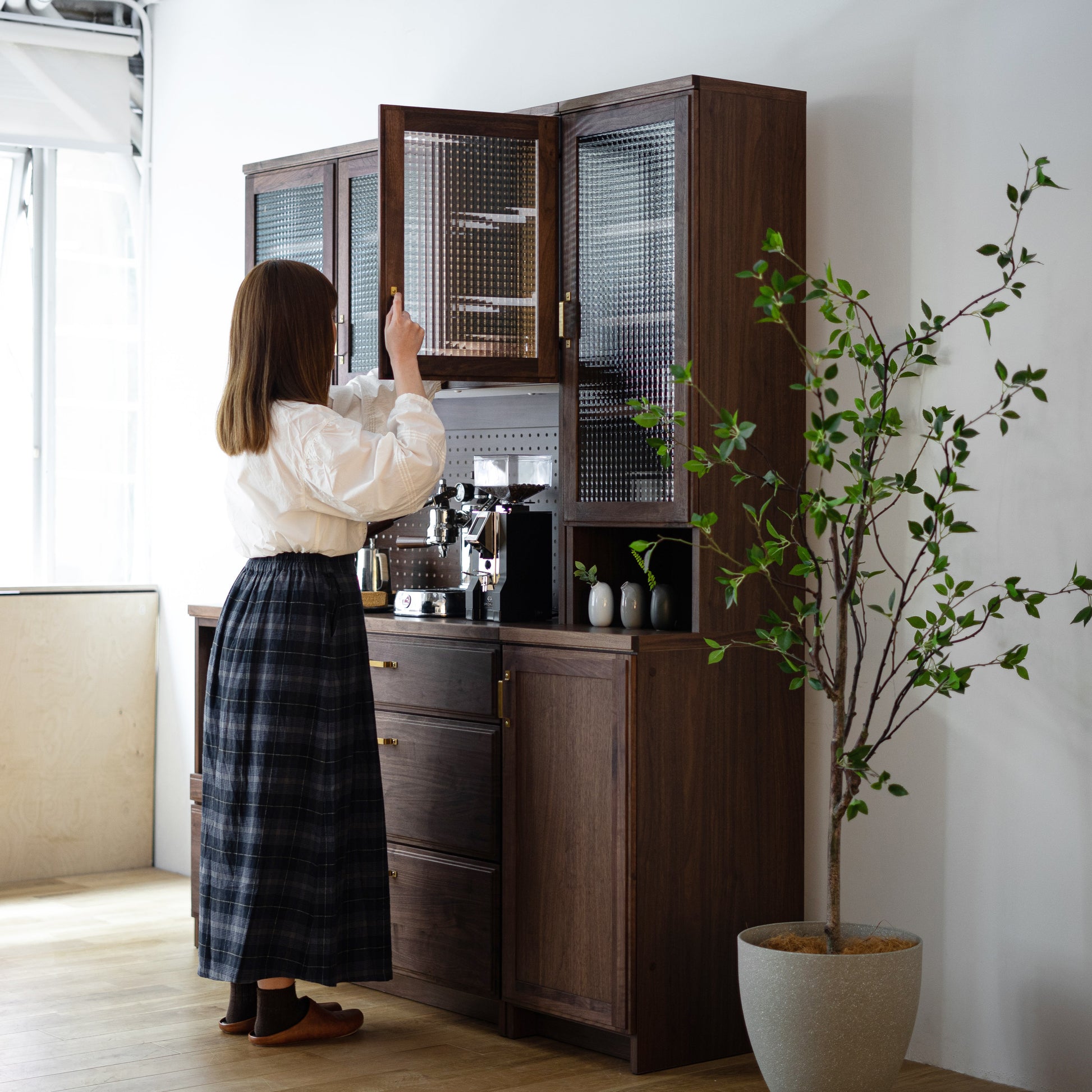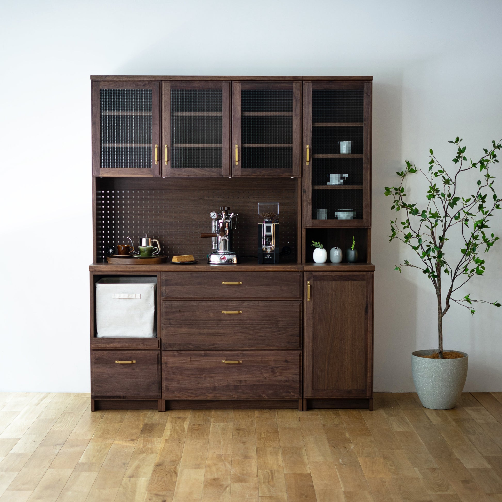 整體高度達 190 公分,亦可左右組合 83 公分半腰款式,可作廚房收納櫃、咖啡櫃、收藏展示櫃或書櫃⋯⋯等,是一款多用途收納櫃。依據喜歡的風格,搭配精緻的銀色或黃銅把手,挑選透明、霧面或復古格紋玻璃,打造獨特的日本木製收納櫃。