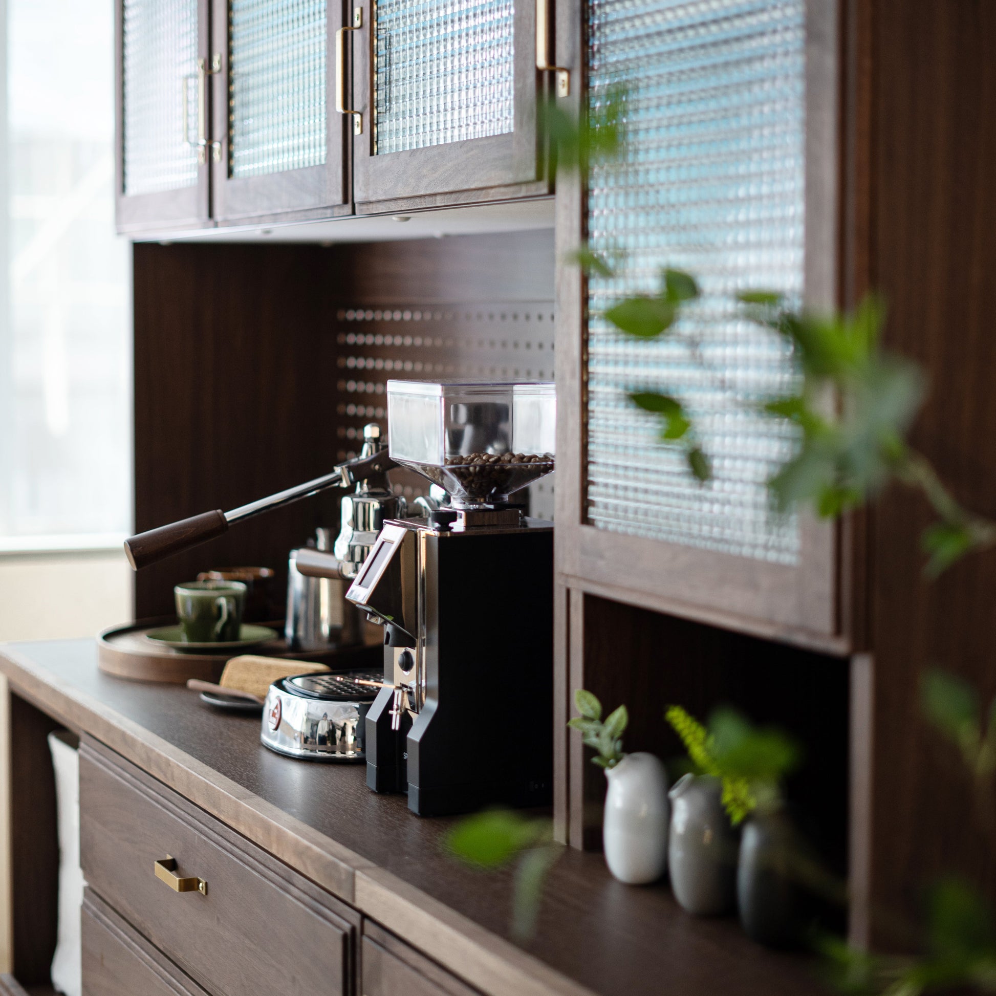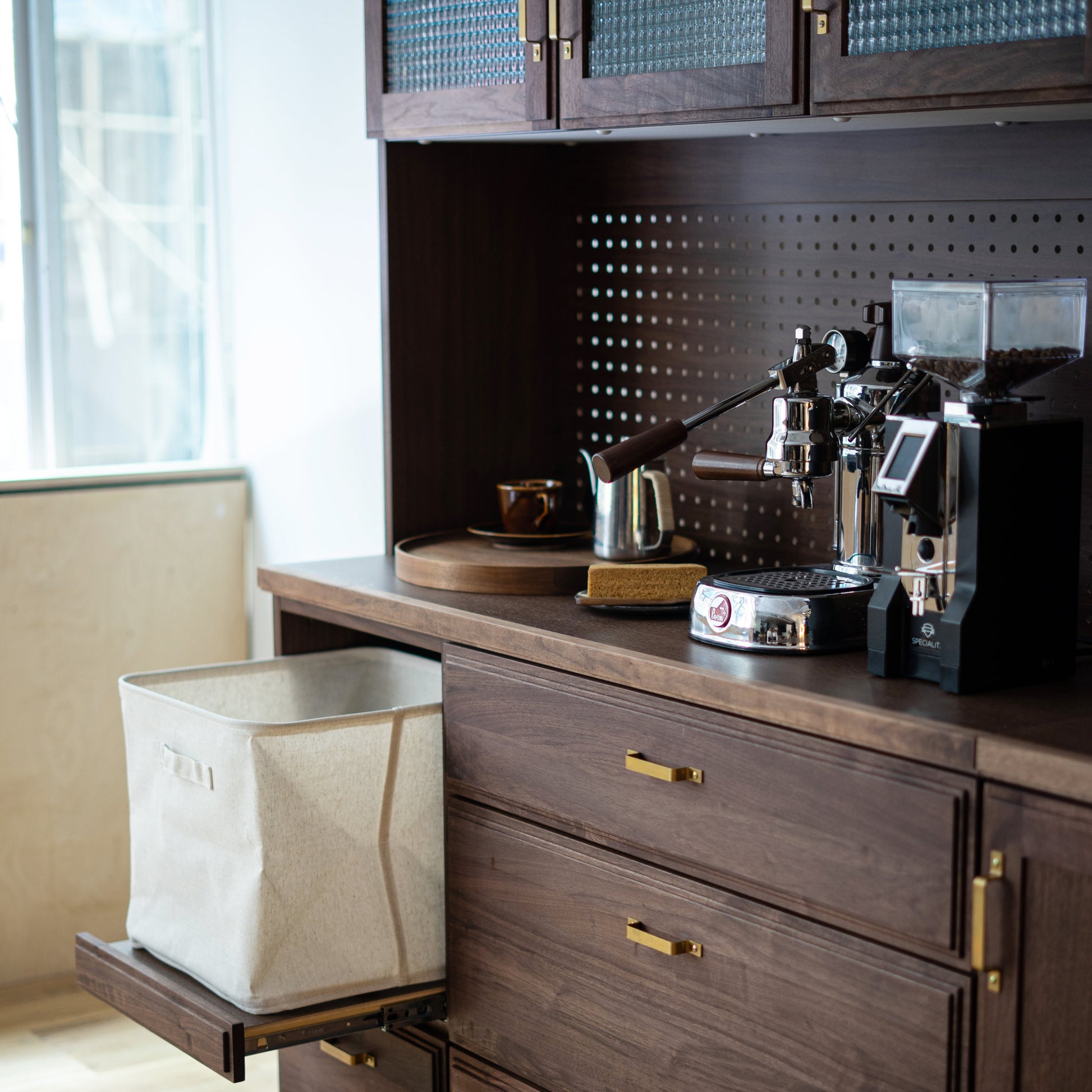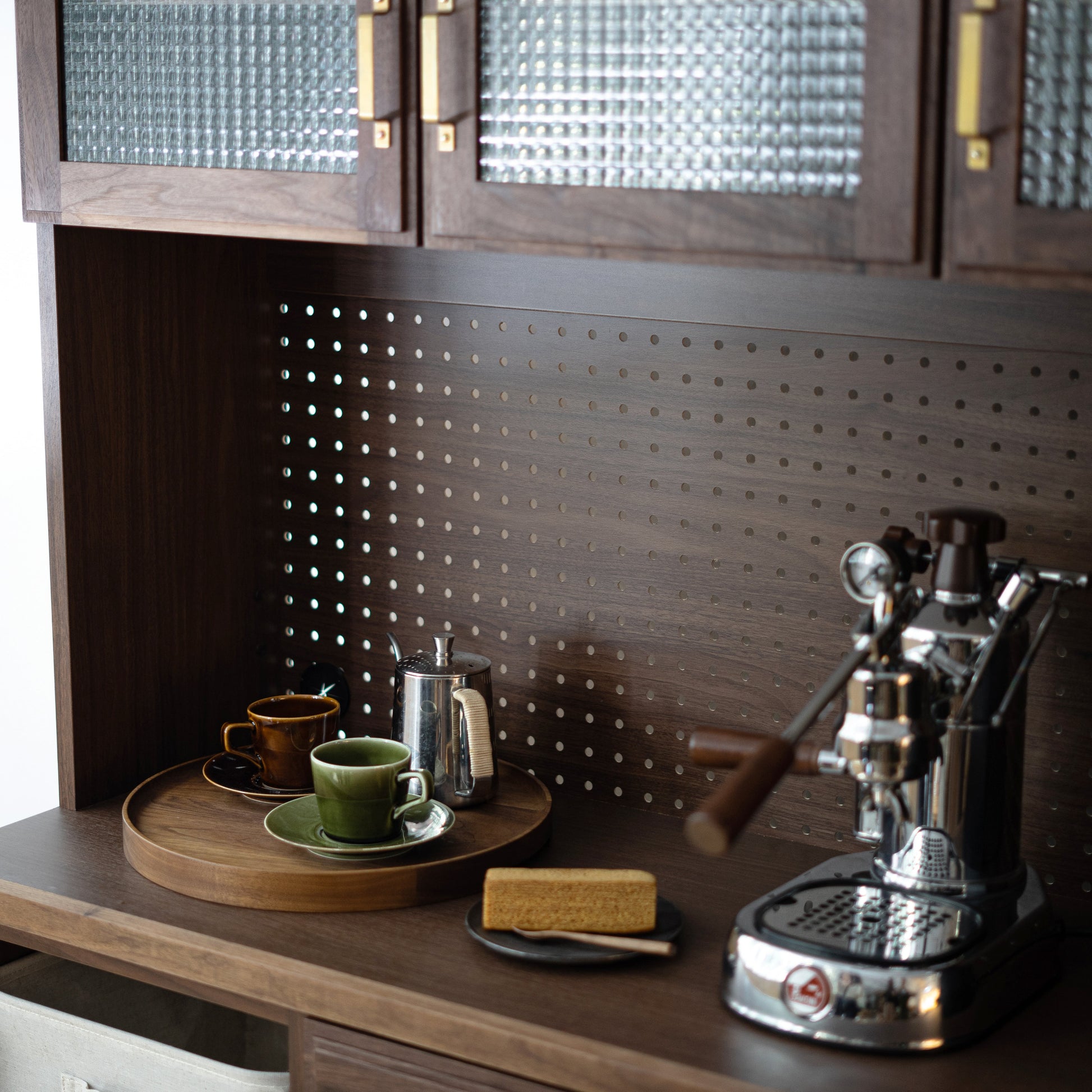 上櫃提供寬 40/60/80/120 組合單品,可選作業空間高 50 公分的洞洞板上櫃,檯面頂部選用日本專利、速乾天然素材,可吸收水蒸氣,咖啡機、烤箱、電鍋皆能放心使用。下櫃有寬 40/60/80 組合單品,從拖拉式電器托盤、抽屜、木門到開放式櫃款皆可搭配,充分考量不同使用情境與實用性。