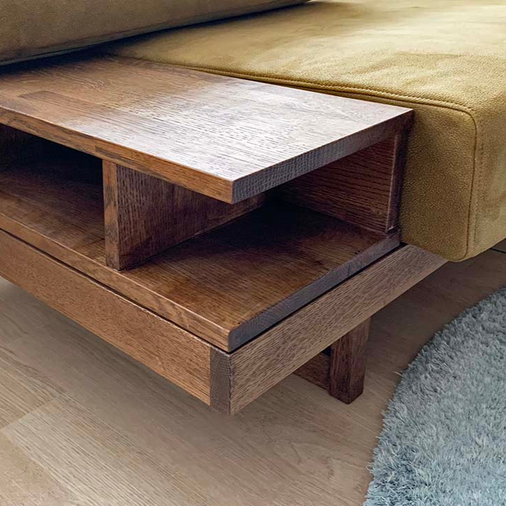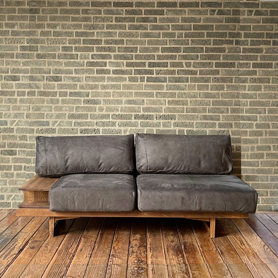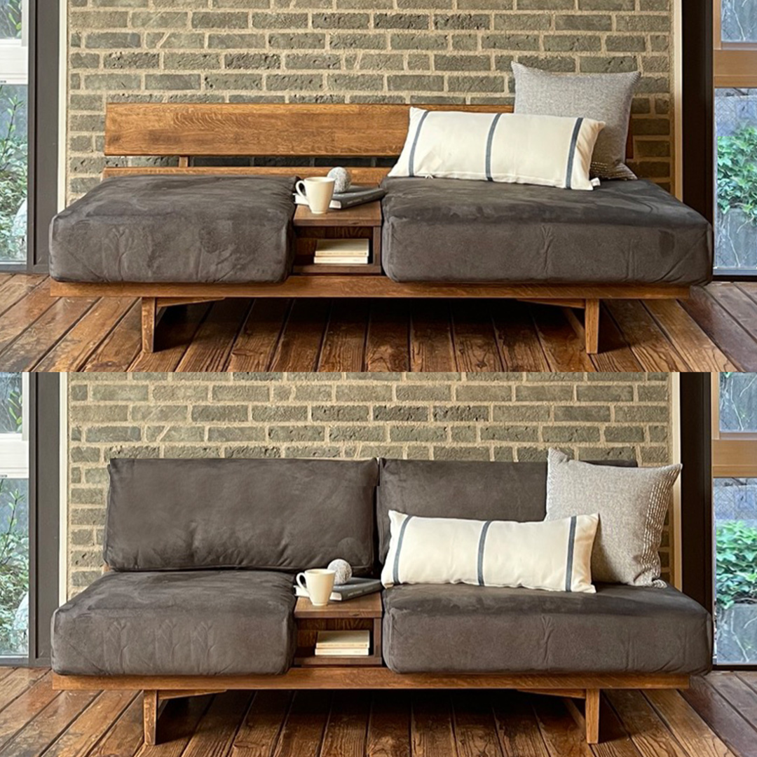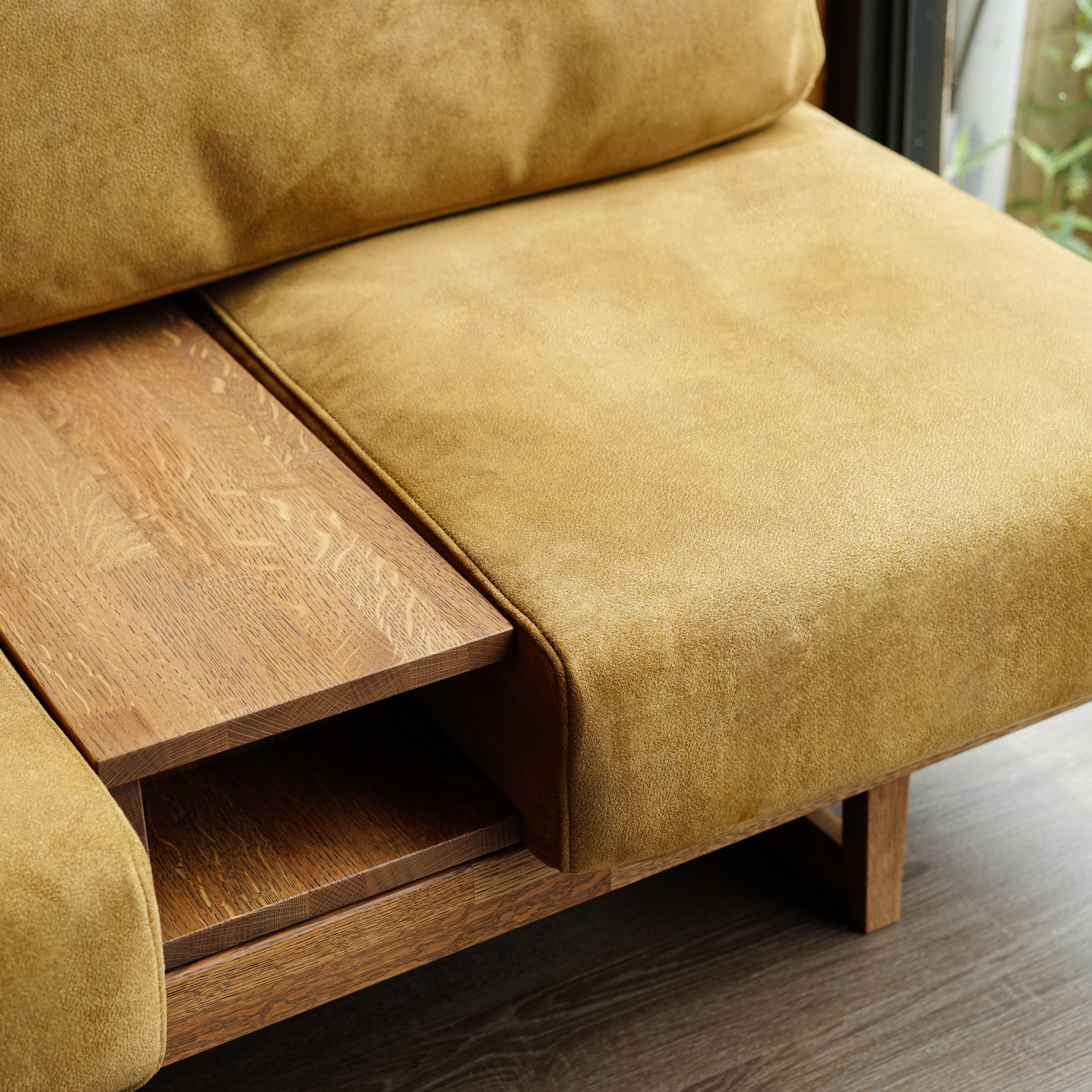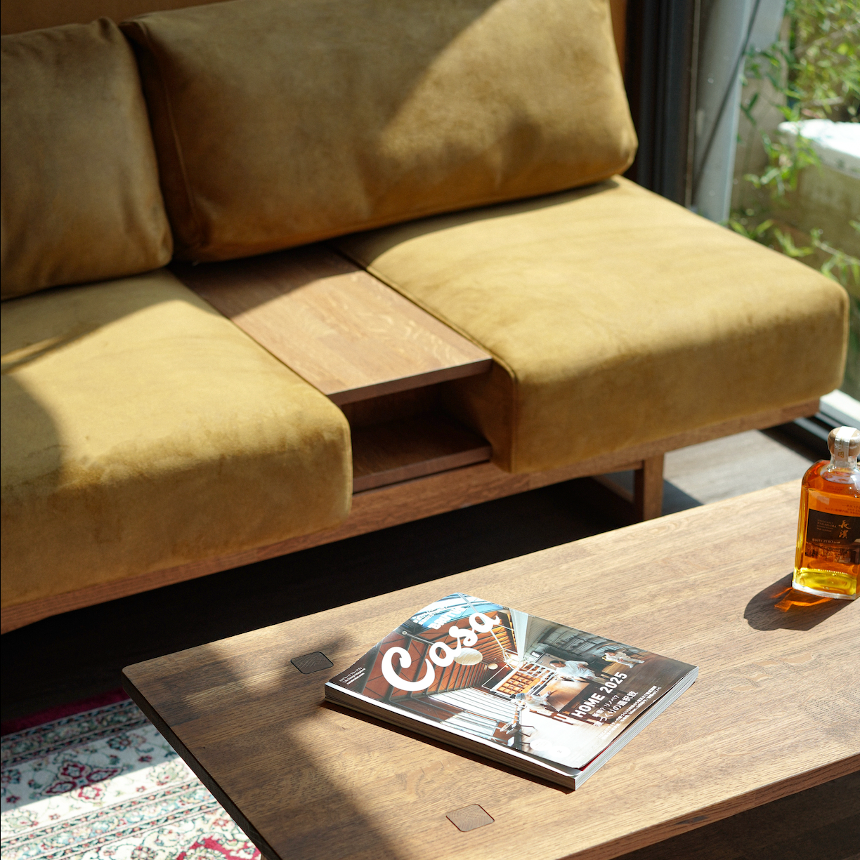 沙發採用耐刮面料,實木邊几可任意移動位置,打造多變靈巧的收納與置物機能。坐墊採用高比例聚氨酯泡棉,坐感挺立、支撐性佳。